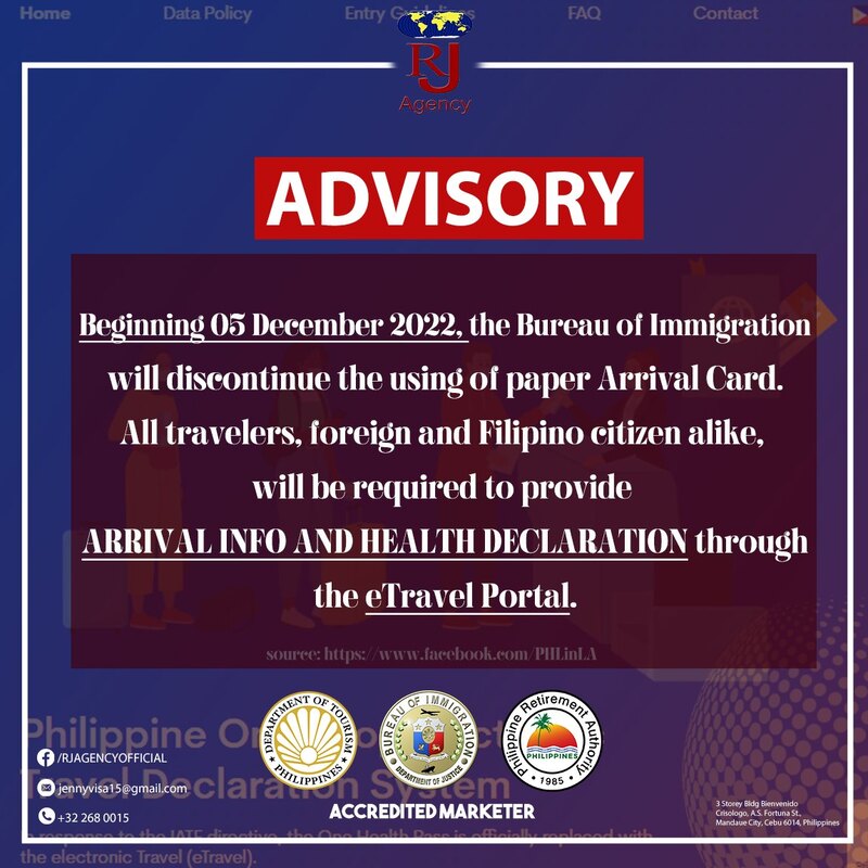 Beginning December 05, 2023, the Bureau of Immigration of the Philippines will discontinue using the paper Arrival Card. All travelers entering the Philippines, foreign and Filipino citizen alike, will be required to provide their arrival information and health declaration through the Philippine eTravel portal. Likewise, the One Health Pass is 𝐍𝐎 𝐋𝐎𝐍𝐆𝐄𝐑 required and its related online system will no longer be accessible. Prior to traveling to the Philippines, please make sure to upload your travel and health information